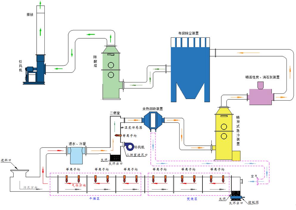 等離子火炬污泥焚燒裝置由等離子火炬、等離子火炬電源、進(jìn)出料裝置、隧道窯(由多個窯爐單元組合而成)、攪拌輸送、尾氣處理系統(tǒng)組合而成。(如圖所示)