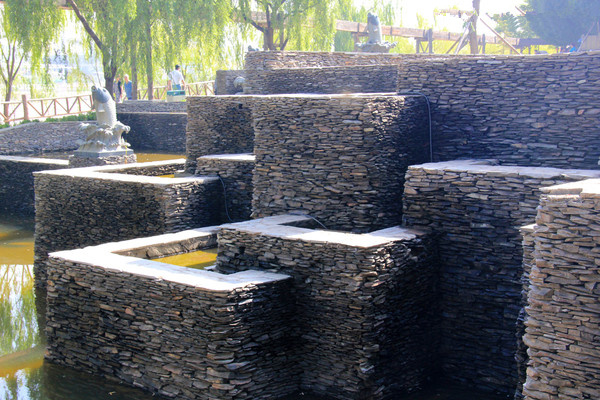 (8)不同水體形態(tài)之間以及水體和其他元素的結(jié)合使用可豐富環(huán)境的多樣性。設(shè)計中通常是多種形式的水體組合使用,如跌水和靜水的結(jié)合、噴泉和跌水的結(jié)合等;也要注意水體和植被、山石等元素結(jié)合起來設(shè)計;還要考慮與水生動植物的結(jié)合,各種不同的動植物,如水中的荷蓮、水邊的蘆葦、各種魚類等,這樣既能體現(xiàn)生物的多樣性,也能增加空間的趣味性。
