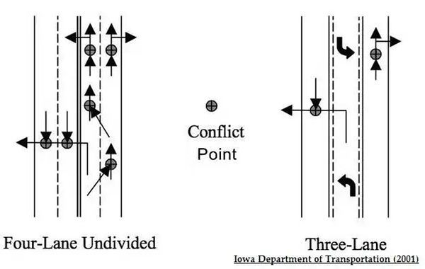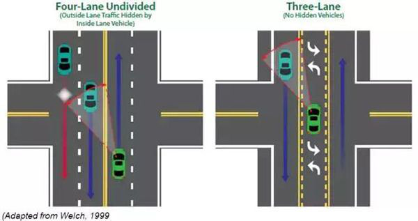 在美國,道路瘦身的形式是將傳統(tǒng)的雙向四車道改造為帶有中央左轉(zhuǎn)專用道的三車道道路,當然還可以通過三車道改造為兩車道、自行車道改造為隔離式(受保護)的自行車專用道、減少寬街道的車道寬度等方式進行「道路瘦身」工程。