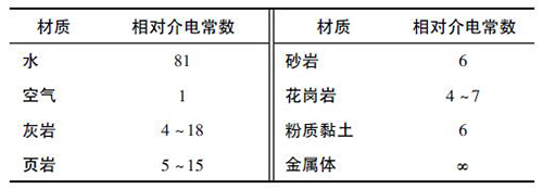 根據(jù)材料的相對介電常數(shù),由式( 2) 可計算出電磁波在該介質中的傳播速度,從而可以根據(jù)反射波的接收時間判斷出反射體的位置。