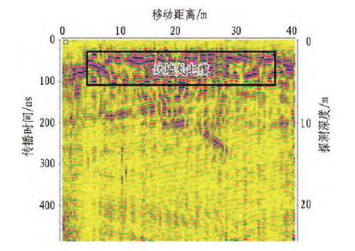 隧道內電纜對地質雷達探測干擾較大,容易造成誤判。電纜通常布置在隧道邊墻,在進行底板下方不良地質體探測時,測線方向與電流方向平行,天線的極化方向垂直于電流方向,如圖4 所示,其在地質雷達圖像上表現(xiàn)為1 組反射強烈的水平同相軸[14]。在底板探測時,需要注意輸電線路與測線之間的相對位置,并記錄下來。