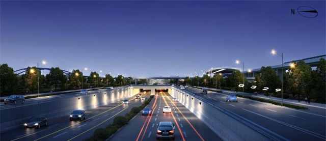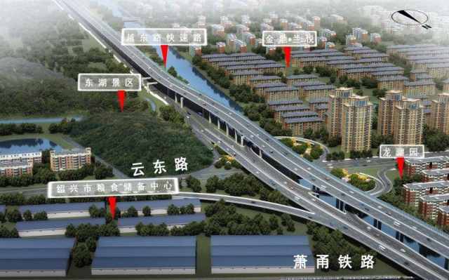 總體方案 :快速路主線西起湖安路,以地面形式過鏡水路,再以地道形式下穿杭甬高鐵紹興北站區段,接著以地面道路形式向東經綠云路、解放大道之后起坡,保留綠云路和解放大道立交。主線過解放大道之后,起坡以高架形式跨越湯公路、中興大道、越東路等,越東至孫曹公路交叉口段還在研究中。