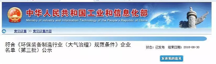 工信部公示符合《環保裝備制造行業(大氣治理)規范條件》企業名單(第三批,含VOCs)