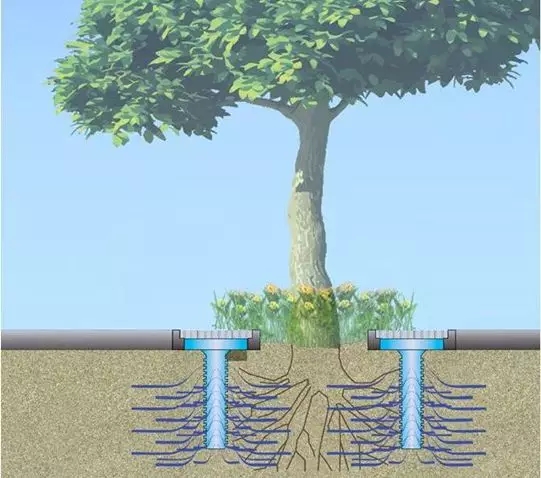 樹池的標(biāo)高一般比路面低一些,用以收集、初步過濾雨水徑流。就行道樹而言,一系列連貫的樹池可以被設(shè)計(jì)成潛在的收水裝置,最大限度地發(fā)揮收集、過濾雨水徑流的作用。