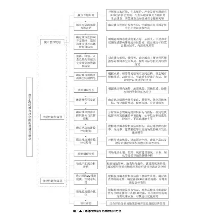 海綿城市建設是一個復雜的系統,其建設應從城市 規劃的源頭著手,將海綿城市理念融入到城市各層級規 劃中,涉及到規劃、園林、水利、市政、道路等多部門、多專業之間的相互協調運作。海綿城市理念下的新型城市規劃方法對設計人員的要求已遠遠超過了傳統城市規劃專業,主要體現在它需要多規合一,即強調不同專業和部門的協調運作;區域規劃,即強調城鄉統籌和流域綜合治理;新型城市化,即強調以人為本的工作思路;生態文明,即強調綠色理念、科學技術和路徑。與營造城市空間的傳統規劃不同,海綿城市規劃關注的是城市與生態環境尤其與水的關系,這就需要打破城市規劃、園林、道路、市政等專業的被動配合與有限交互局面,解決不同專業技術協調性的困頓?;诤>d城市理念的城市規劃方法見圖 3。