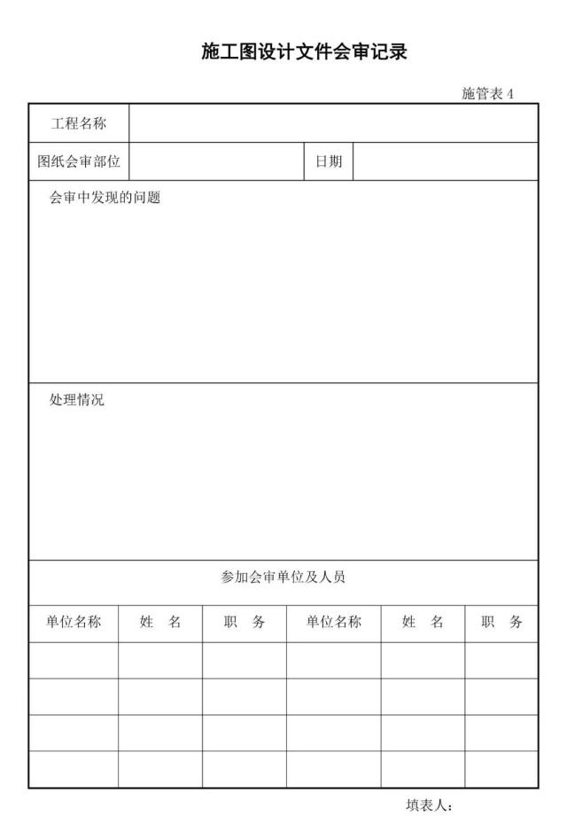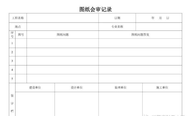 備 注:上表為城市(市政)道路工程國標(biāo)使用表格,各地表格存在差異,優(yōu)先選用各地方要求的相應(yīng)表格,其次考慮使用國標(biāo)表格,再次為了方便圖紙會審分類管理,也可參考使用下表。圖紙會審記錄需各單位項(xiàng)目負(fù)責(zé)人簽字,加蓋公章,作為施工圖紙的補(bǔ)充,后期為結(jié)算工程量提供依據(jù)。(以上僅供參考)