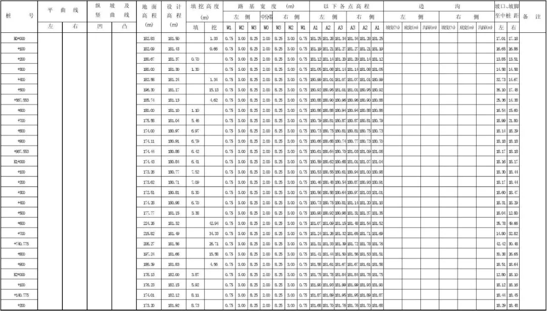 路基設(shè)計(jì)表:為便于施工,平曲線設(shè)計(jì)超高后,道路中線和內(nèi)、外側(cè)(路肩)邊緣線與設(shè)計(jì)高程之差應(yīng)列于路基設(shè)計(jì)表中。計(jì)算時(shí)需要按照超高過(guò)渡段、全超高段分別計(jì)算中線、內(nèi)緣及外緣的高程。