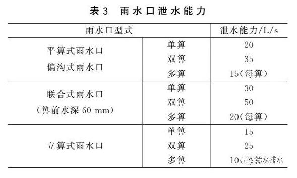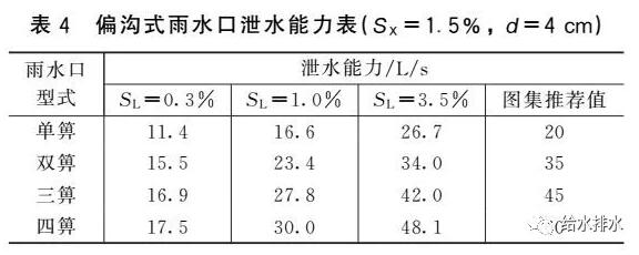 國家標準圖集《雨水口》(16S518)提供了一個在一定水力條件下(道路縱坡0.3%~3.5%,橫坡1.5%,箅前水深40  mm)通過1∶1的水工模型經過試驗確定的不同型式雨水口泄水能力,如表3所示。