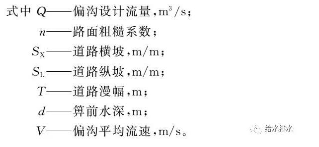 偏溝設計流量Q由本段流量和前段超越流量(計算方法見后)組成,本段流量是一個隨集水時間變化而變化的值,考慮到偏溝匯水面積通常很小,可以直接假定集水時間t=5  min,代入當地暴雨強度公式即可算出設計暴雨強度q,乘以匯水區面積和徑流系數即為本段流量(根據最新規范要求,還需乘以安全系數1.5~3.0)。