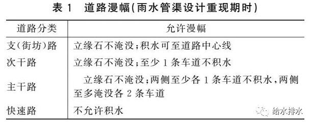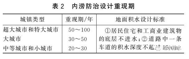 《Urban Storm Drainage Criteria  Manual》對于內澇防治設計重現期時的道路積水有詳細規定,我國《室外排水設計規范》有類似規定,見表2。