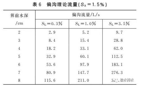 (1)雨水口泄水能力不應超過其偏溝流量,而我國標準圖集泄水能力推薦值卻超過了偏溝流量。對于箅前水深、道路橫坡和縱坡一定的偏溝式雨水口,其偏溝流量是固定的(見表6)。對于箅前水深4  cm的偏溝式雨水口,偏溝式雨水口泄水能力不應大于18.2 L/s(SL=0.3%)、33.1 L/s(SL=1.0%)、62.0  L/s(SL=3.5%),這和箅子數量無關。