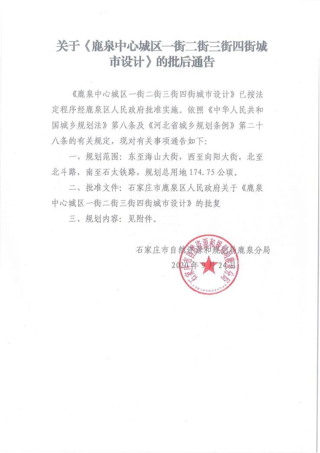 從鹿泉區人民政府官網獲悉,9月24日,自然資源和規劃局發布了關于《鹿泉中心城區一街二街三街四街城市設計》的批后通告。通告顯示,規劃范圍為東至海山大街,西至向陽大街,北至北斗路,南至石太鐵路,規劃總用地174.75公頃(約合2621.25畝),采用“一軸一核,三心四街”的功能布局結構。