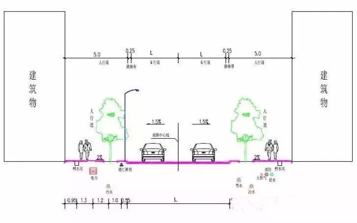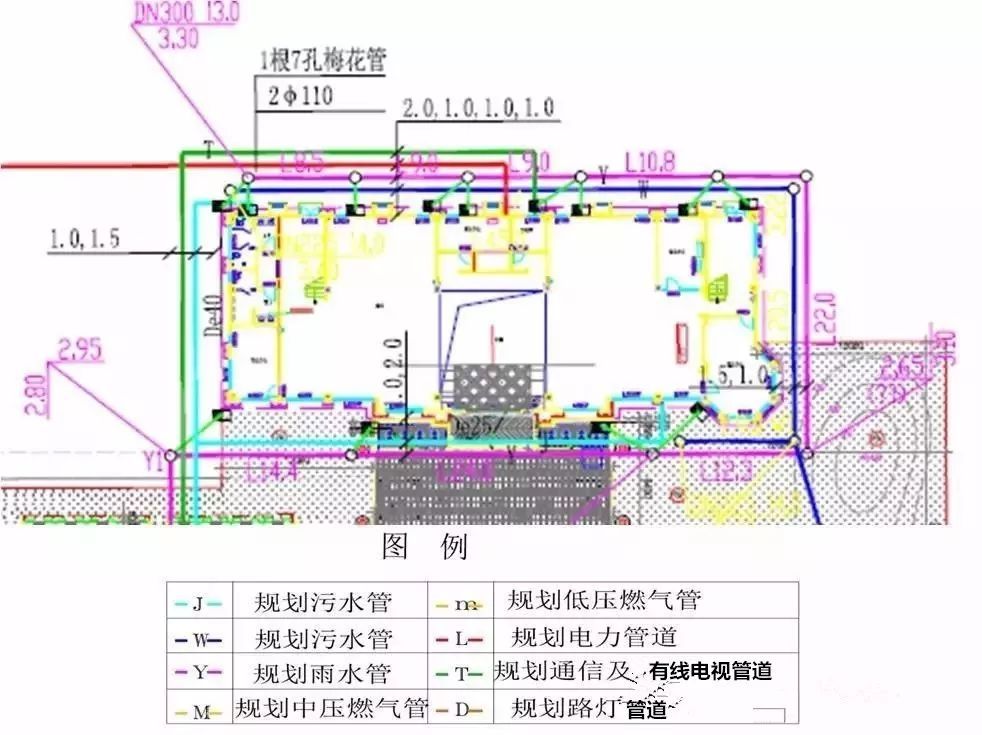 1、沒有具體平面尺寸,只有局部斷面圖,確定各個(gè)管道平行向的間距,但往往與景觀道路、綠化相矛盾;