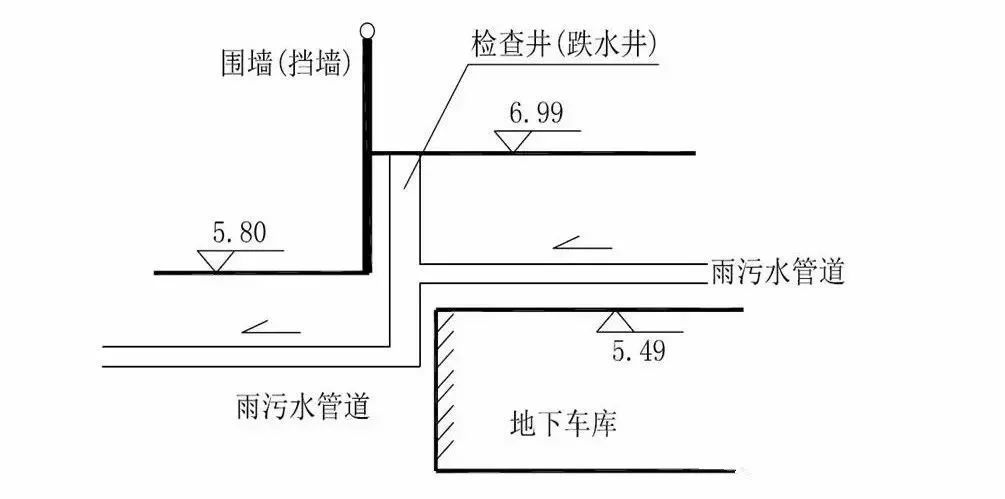 針對項(xiàng)目地下管線需跨越地庫、小區(qū)環(huán)路、市政道路3個(gè)標(biāo)高,小區(qū)雨污水管無法直接排入市政管網(wǎng),設(shè)計(jì)上選用跌水井,如圖。