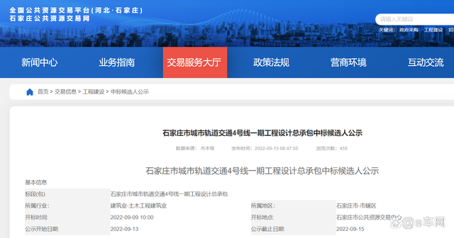 石家莊市城市軌道交通4號線一期工程設計總承包中標候選人公示