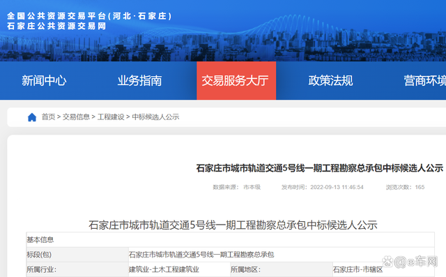 石家莊市城市軌道交通5號線一期工程勘察總承包中標候選人公示