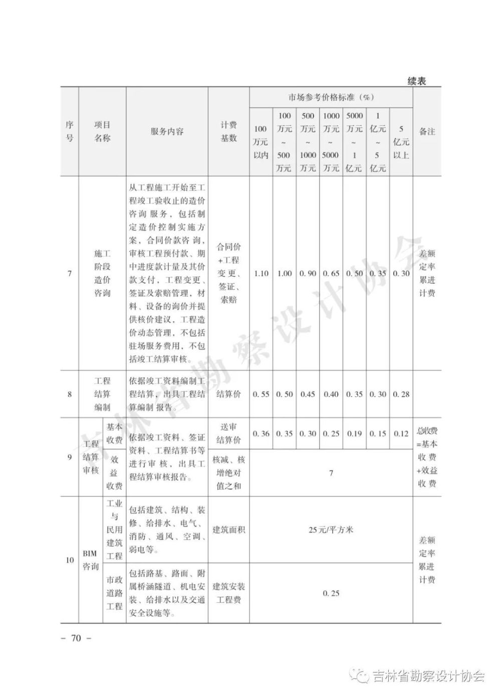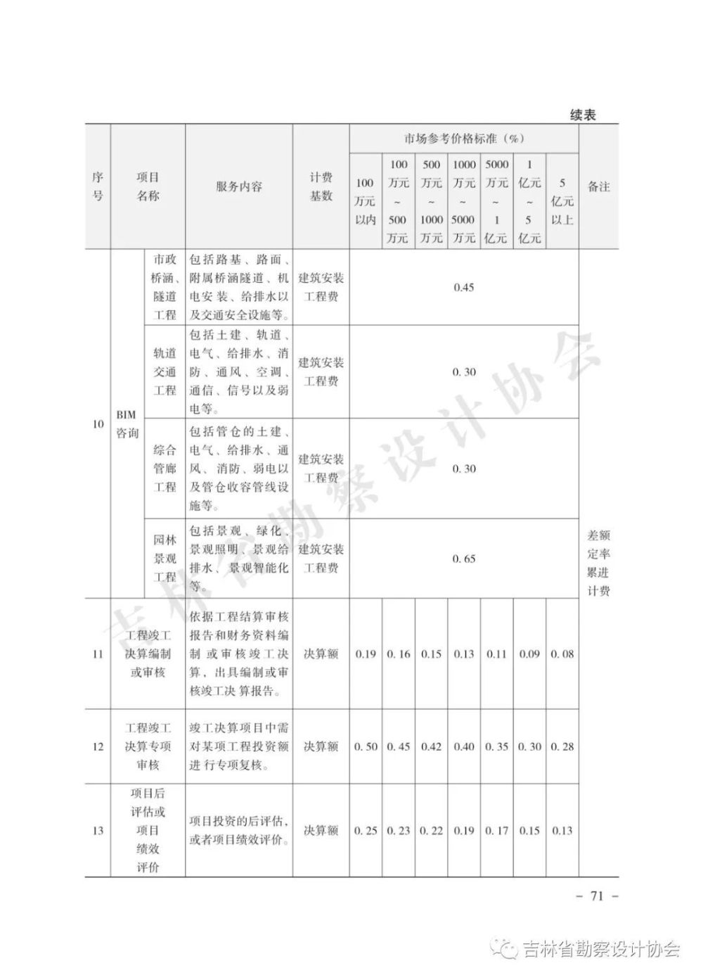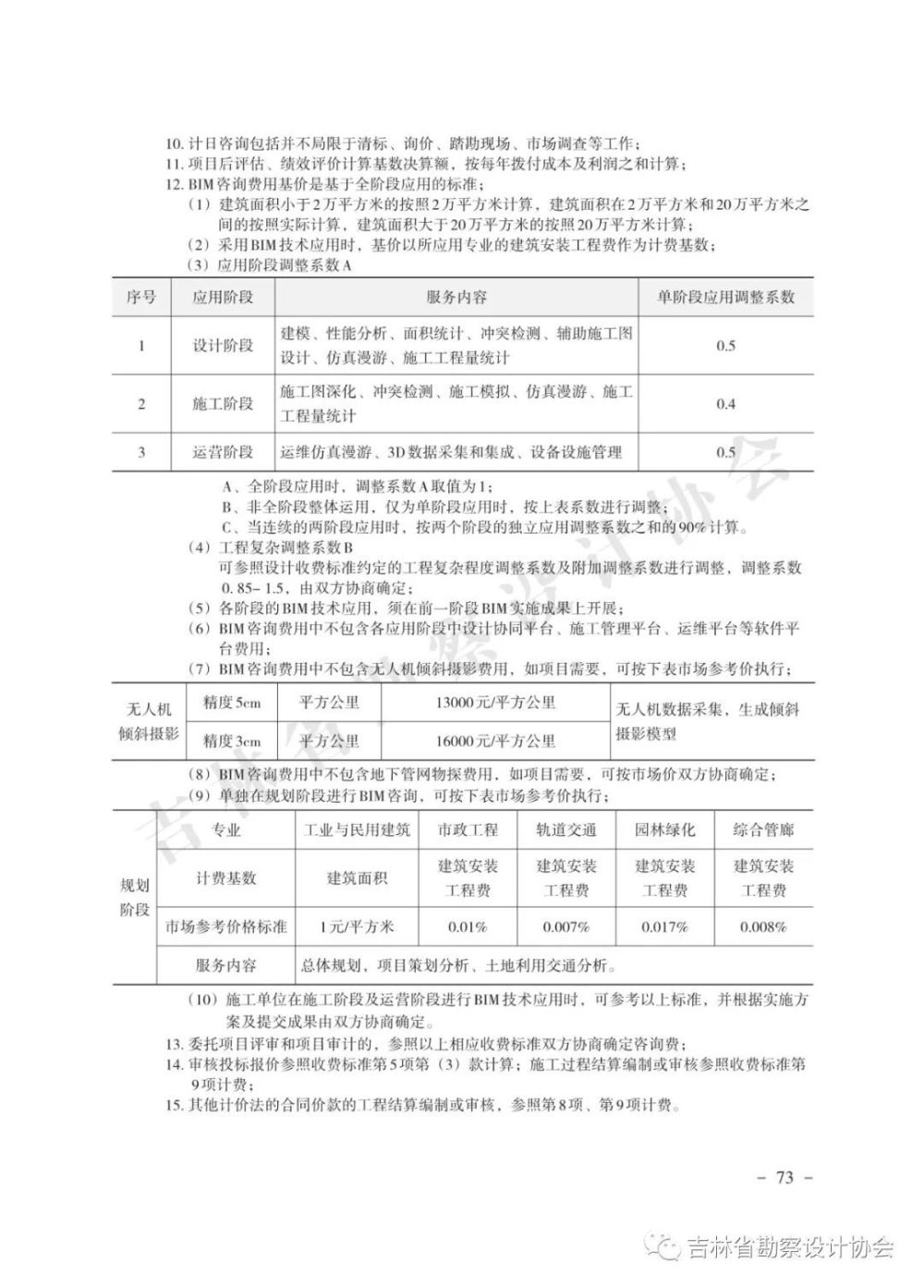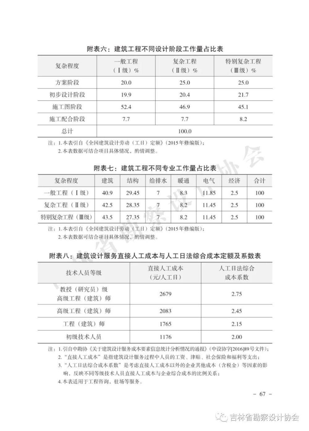 吉林省勘察設計協會通過對各地市勘察設計服務成本要素信息進行統計、分析及研究,在組織會員單位充分研討的基礎上,結合該省市級情況,對《吉林省建筑工程勘察設計收費指導價(試行)》予以修編,形成了《吉林省工程勘察設計收費導則》。