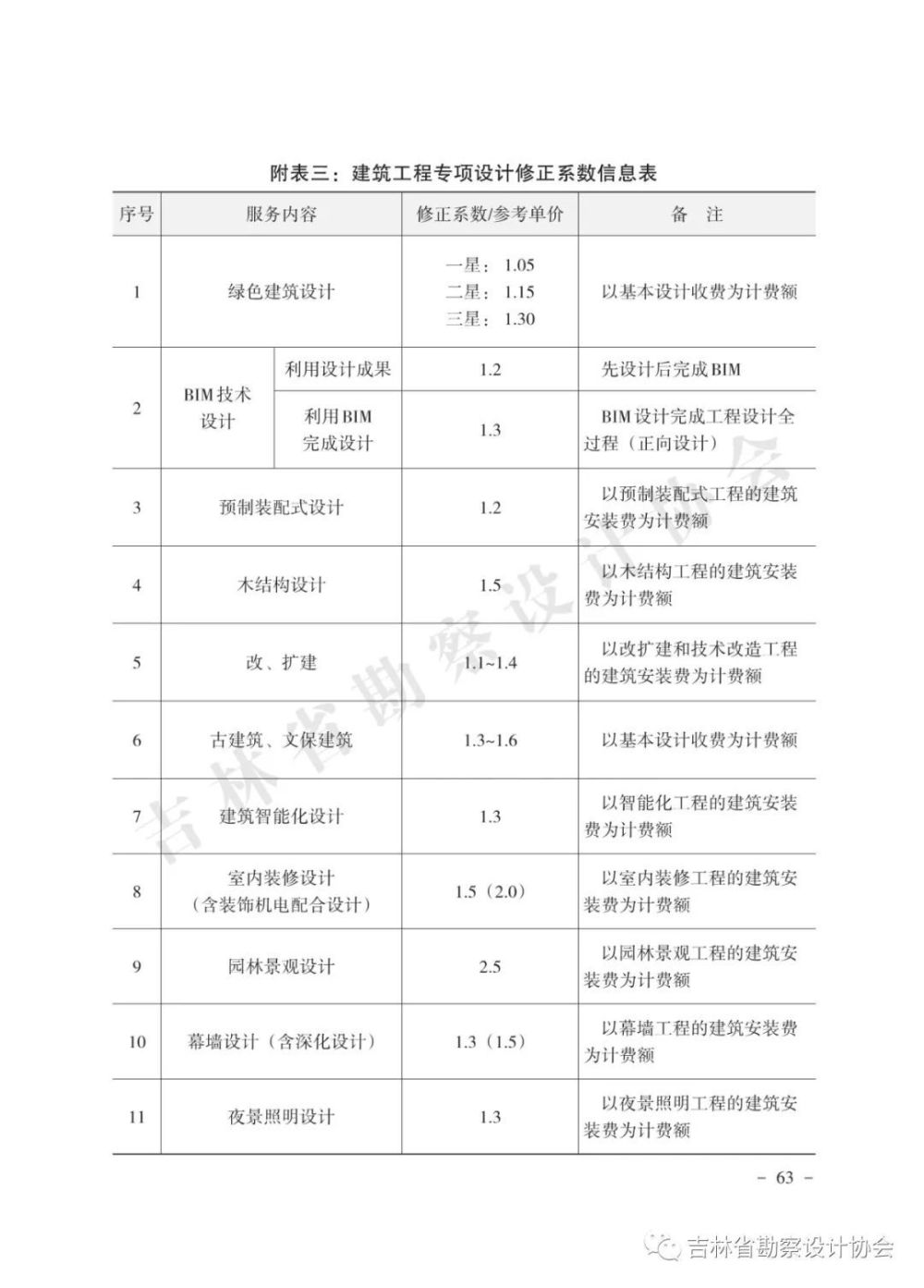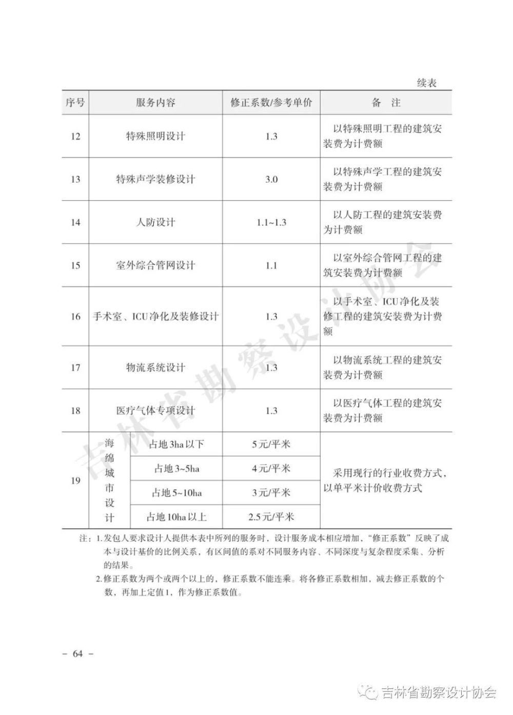 三是增加大量專項設計修正。隨著勘察設計行業發展,設計內容也越來越豐富,在此版《導則》里,建筑工程充分考慮各項新增設計服務內容,包括綠色建筑設計、BIM技術設計、預制裝配式設計、木結構設計、改擴建、古建筑、建筑智能化設計、幕墻設計、夜景照明設計、室外綜合管網設計、手術室、ICU凈化及裝修設計、物流系統設計、醫療氣體專項設計、海綿城市設計等19項內容,設計服務包括以上內容的將在收費基價基礎上繼續上調價格。