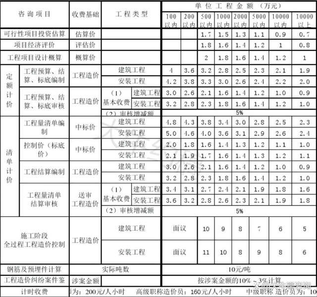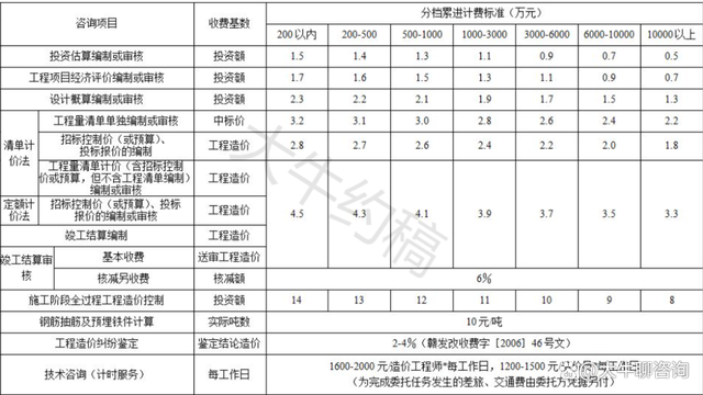 4.工程造價咨詢服務收費按照本標準計算收費,低于每項3000元的按3000收取,超出3000元時按本標準收取;