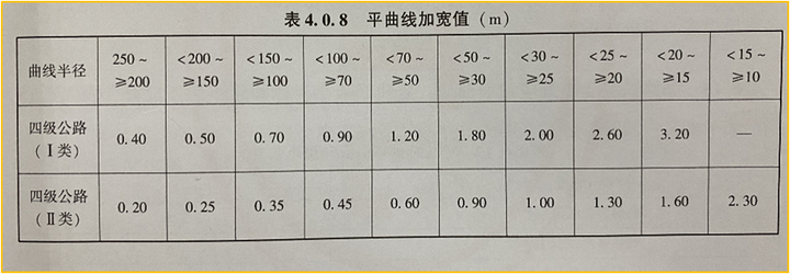《標(biāo)準(zhǔn)》表4.0.8 平曲線加寬值