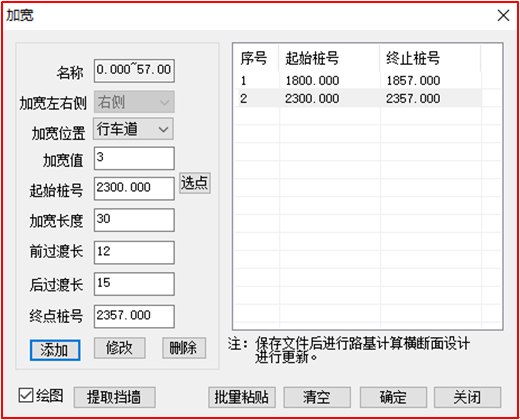 緯地軟件實(shí)現(xiàn)任意復(fù)雜線形設(shè)計3、批量設(shè)計錯車道和斷面寬度變化針對低等級公路需要添加的錯車道數(shù)量較多或者設(shè)置護(hù)欄時土路肩需要加寬的情況,緯地軟件增加了快速加寬設(shè)計功能。可根據(jù)加寬需求設(shè)置加寬名稱、加寬位置(含行車道、硬路肩、土路肩)、加寬值、加寬起終點(diǎn)樁號、加寬長度、過渡段長度等參數(shù),也可直接提取該項目的擋墻設(shè)置段落進(jìn)行加寬設(shè)計。