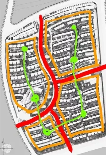 強(qiáng)調(diào)南北主線(xiàn), 通過(guò)錯(cuò)開(kāi)的方式獲得變化,內(nèi)部加入環(huán)形路聯(lián)系四個(gè)組團(tuán)中心,適合低密度產(chǎn)品。