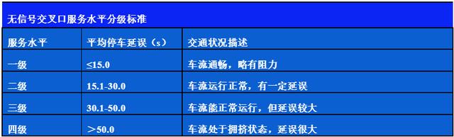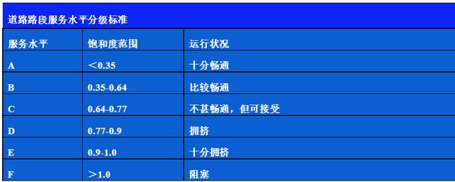 建設工程影響范圍內道路路段、交叉口是否產生新的交通瓶頸點,是否造成路段局部或交叉口某個流向交通狀況惡化,是否能夠維持道路路段或交叉口服務水平處于合理范圍。以服務水平分級作為主要評價內容,以延誤或飽和度為基本評價指標,也可采用排隊長度等指標。