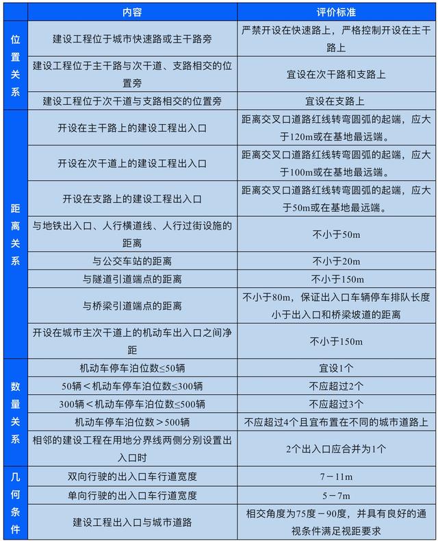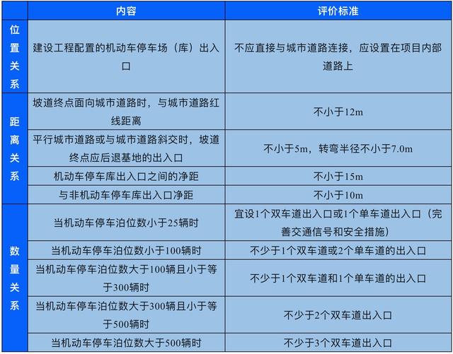 建設工程出入口與機動車停車場(庫)出入口評價主要內容及標準如下。