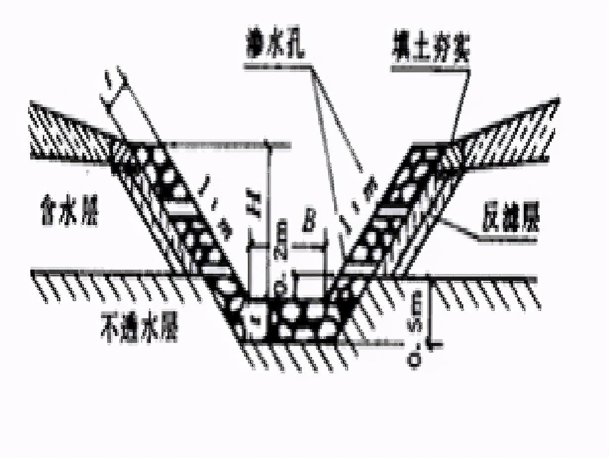 用于降低地下水位、排除地下水的滲溝又稱平式滲溝,包括埋置深度2-6m的淺埋滲溝;按照有無滲水管可分為有管滲溝和無管滲溝;同時起支撐邊坡作用的滲溝稱為邊坡滲溝。