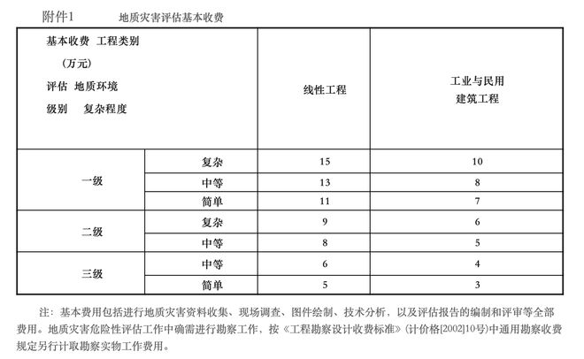 第八條 地質災害評估收費基準價由評估基本收費、工程規模調整系數、工程類別調整系數和地區調整系數綜合確定。其中,地質災害評估基本收費根據建設項目重要性、地質環境復雜程度、工程類別和評估級別等確定。地質災害評估收費包括開展資料搜集、現場調查、圖件繪制、技術分析,以及評估報告的編制和評審等全部費用。