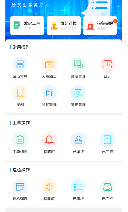 微信小程序主要為用戶提供各種線上服務(wù),涵蓋工單模塊、巡檢模塊、報警模塊、站點(diǎn)管理等功能。
