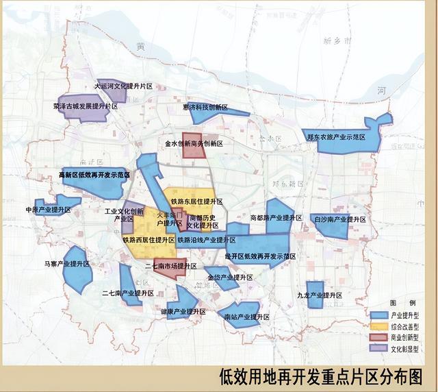 產(chǎn)業(yè)提升型:惠濟(jì)科技創(chuàng)新區(qū)、鄭東農(nóng)旅產(chǎn)業(yè)示范區(qū)、高新區(qū)低效再開發(fā)示范區(qū)、中原產(chǎn)業(yè)提升區(qū)、馬寨產(chǎn)業(yè)提升區(qū)、二七南產(chǎn)業(yè)提升區(qū)、健康產(chǎn)業(yè)提升區(qū)、南站產(chǎn)業(yè)提升區(qū)、鐵路沿線產(chǎn)業(yè)提升區(qū)、金岱產(chǎn)業(yè)提升區(qū)、經(jīng)開區(qū)低效再開發(fā)示范區(qū)、九龍產(chǎn)業(yè)提升區(qū)、商都路產(chǎn)業(yè)提升區(qū)、白沙南產(chǎn)業(yè)提升區(qū)。